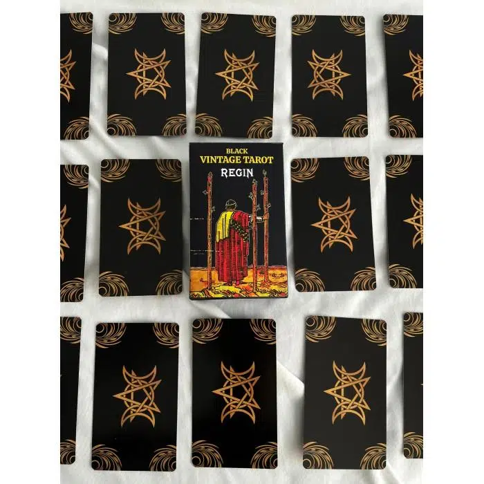 Regin Black Vintage Tarot dünyaca ünlü ressam Pamela Colman Smith tarafından 1900 lü yılların başında çizilmiş 78 sanat eserinin birleşiminden oluşan bir majör ve minör arcana tarot destesidir. Regin Collective yorumuyla tekrar tasarlanan bu deste eşsiz bir koleksiyon ürünü haline getirildi. yüksek baskı kalitesine sahip Black&White kartlar, yeni başlayanlar ve profesyoneller için mükemmel bir seçimdir. Kartlar parlak görünmesi için özel olarak tasarlanmıştır ve uzun ömürlü olması için laminasyon işlemi uygulanmıştır.